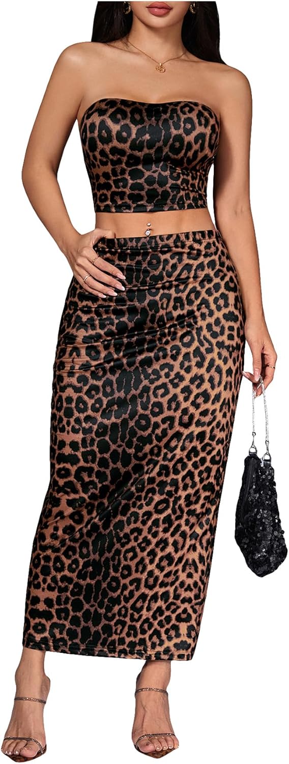 Milumia Women's Two Piece Skirt Set Cheetah Print Strapless Crop Tube Top Maxi Skirts Rave Ouftits