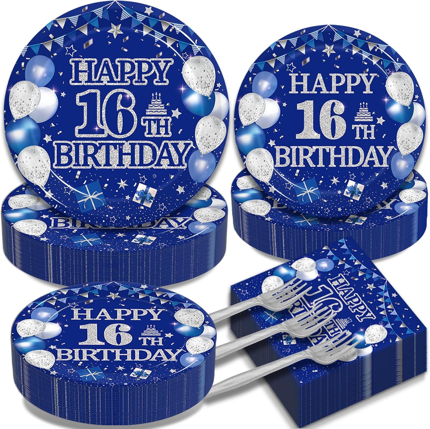- Complete 16th Birthday Party Decoration Set: Our 16th birthday plates and napkins set includes everything you need for a party of 50 guests - 50 blue birthday dinner plates (9''), 50 blue birthday dessert plates (7''), 50 blue birthday napkins (13''), and 50 sliver forks (6.5''). Perfect for hosting your boy 16th birthday party with ease!