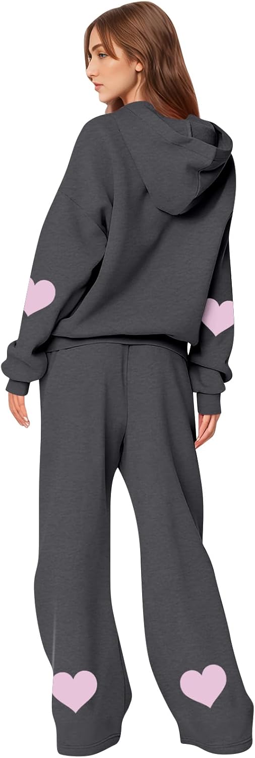 Two Piece Sets for Women Heart Print Soft Fleece Sweatsuits Cute Y2k Comfy Preppy Oversized Hoodie Wide Leg Pants