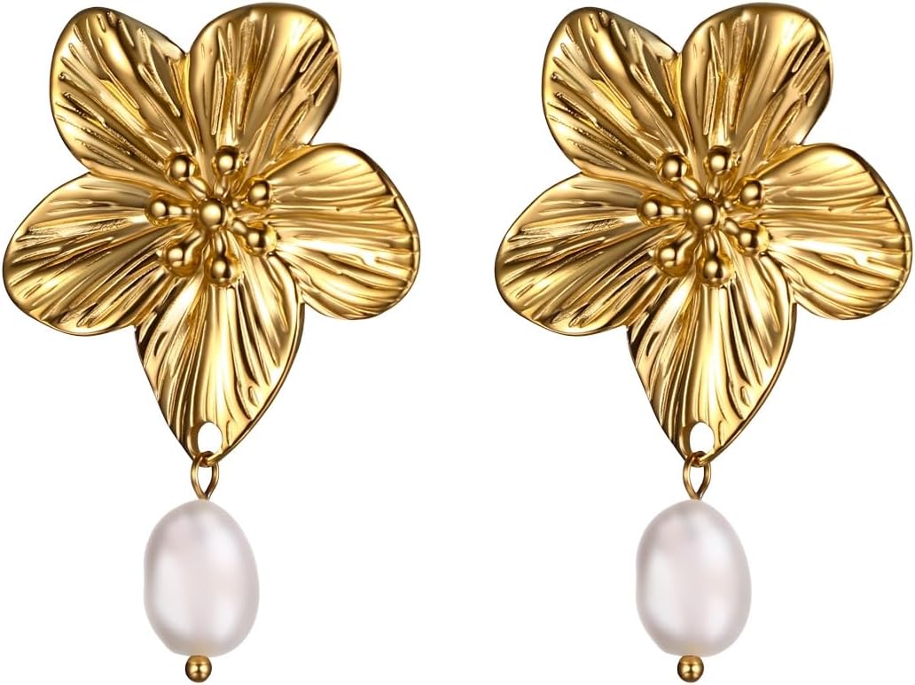 Flower Stud Earrings for Women: Stainless Steel Dainty Floral Drop Earrings with Pearl Dangle Statement Jewelry for Wedding Party