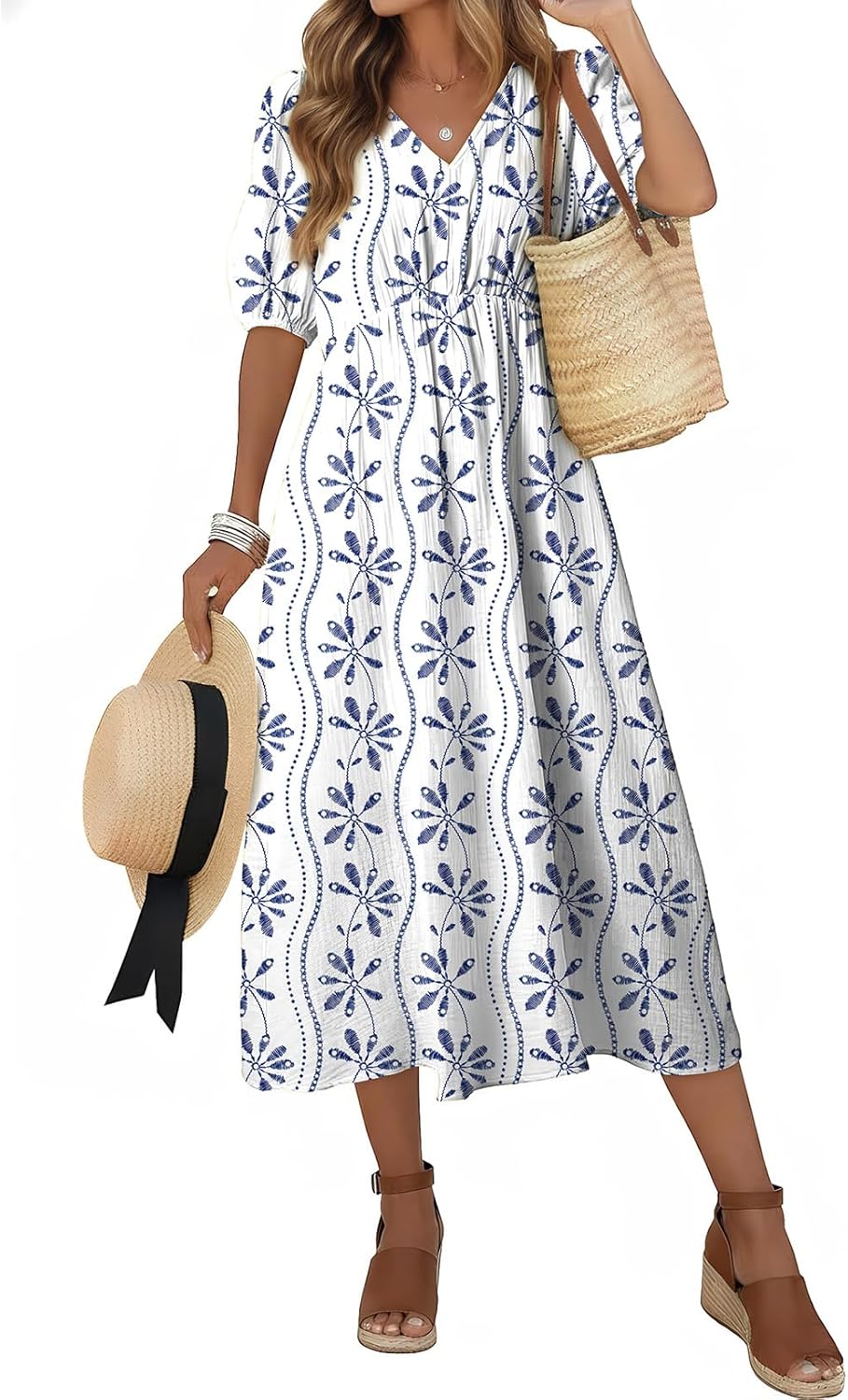 Dokotoo Women's Summer Short Sleeve V Neck Casual Boho Dresses Elastic High Waist Floral Flowy Maxi Dresses with Pockets