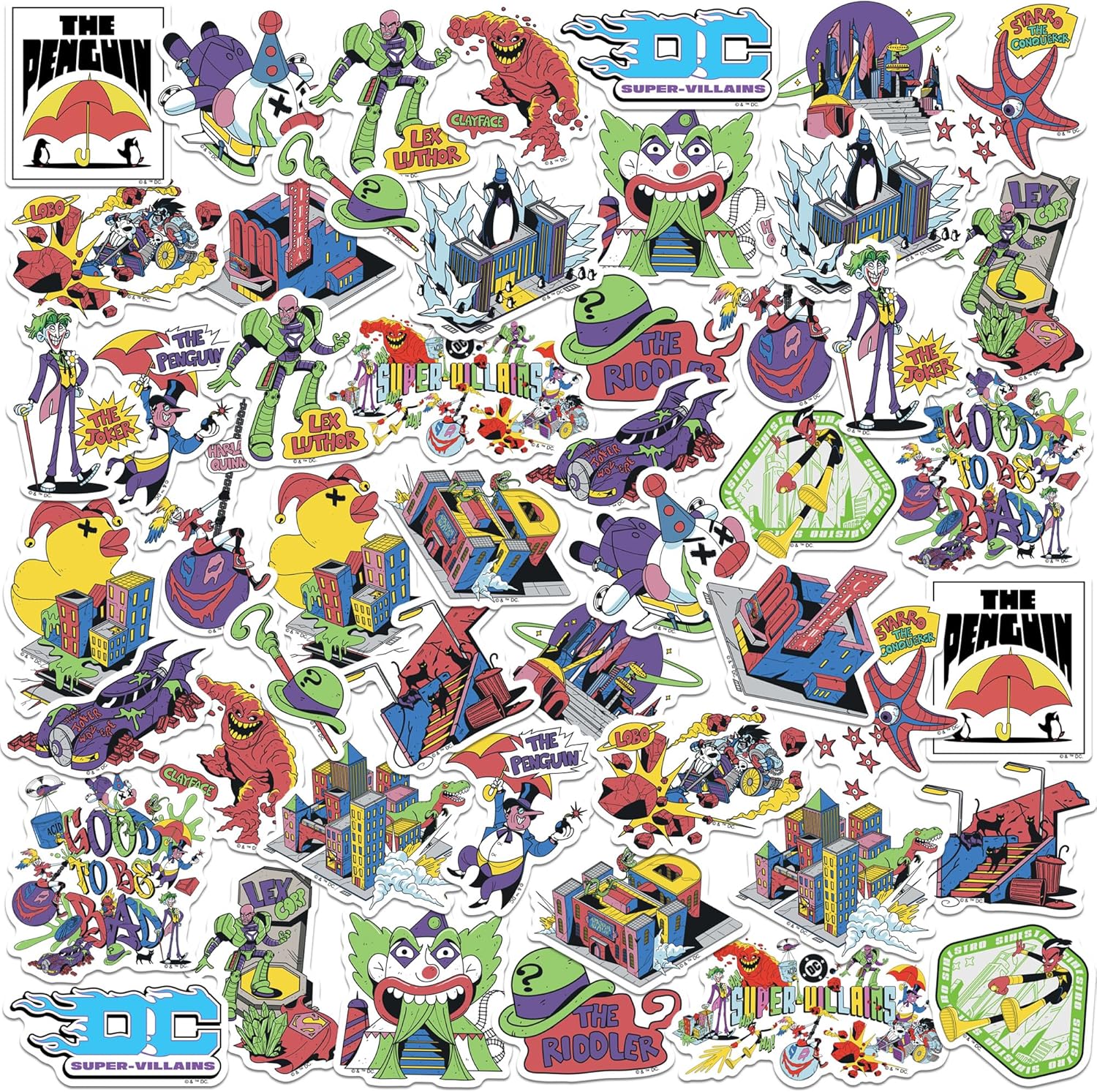 - REIMAGINED DC VILLAIN DESIGNS: Includes 50 die-cut vinyl stickers featuring DC’s most iconic villains reimagined in bold, graphic, and stylized artwork, including The Joker, Harley Quinn, The Penguin, Lex Luthor, The Riddler, Clayface, and other legendary adversaries in dynamic compositions.