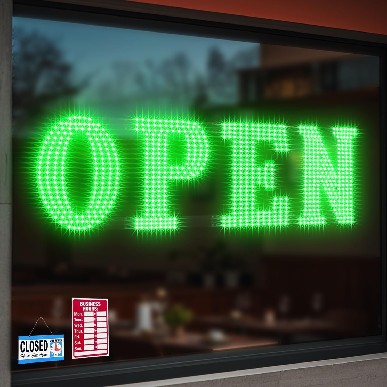 - Easy to Install:This open sign includes a sturdy chain for hanging and easy to install on any storefront, glass door or window. Equipped with power adapter.It is very easy to install and portable to move, bright and eye-catching colors can decorate your store appearance and attract more customers.