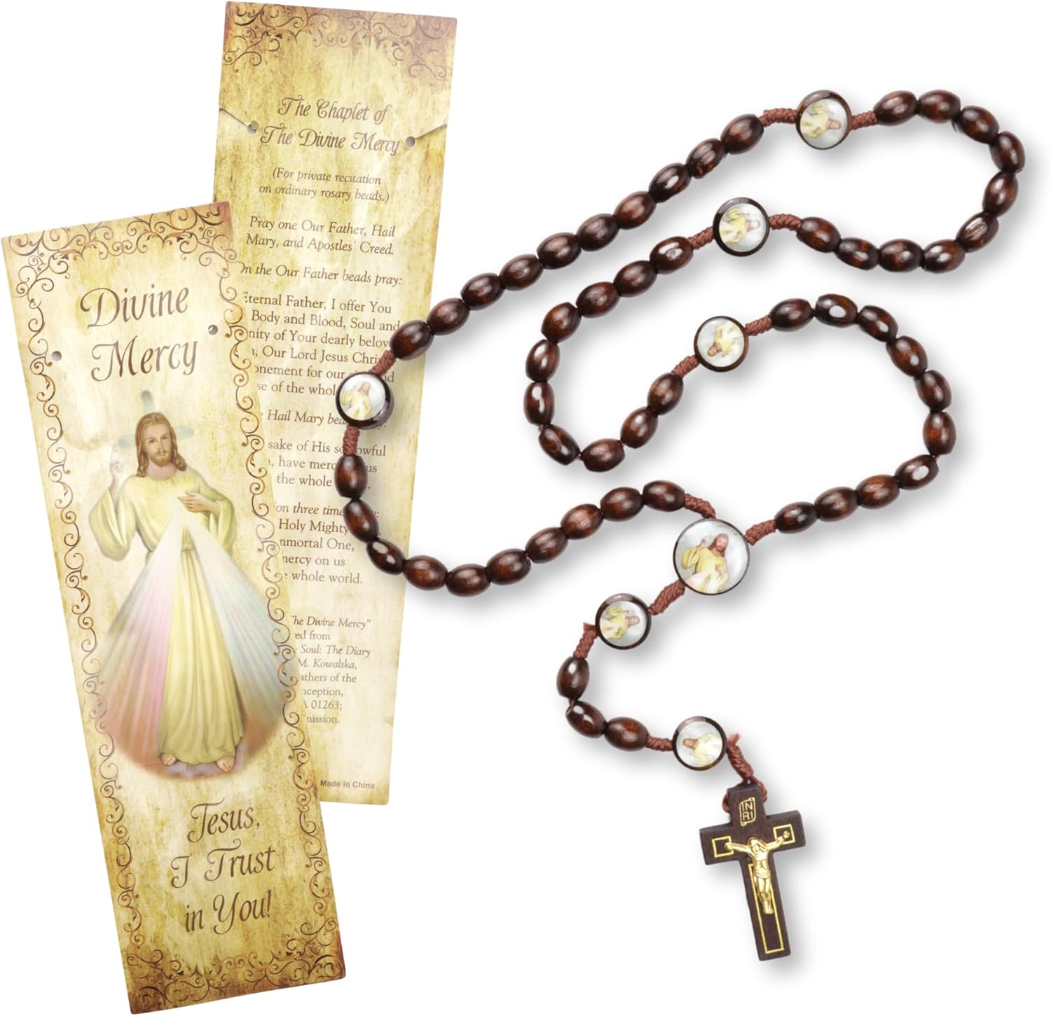 - Features a detailed, full color Divine Mercy picture centerpiece, with an engraved wood crucifix