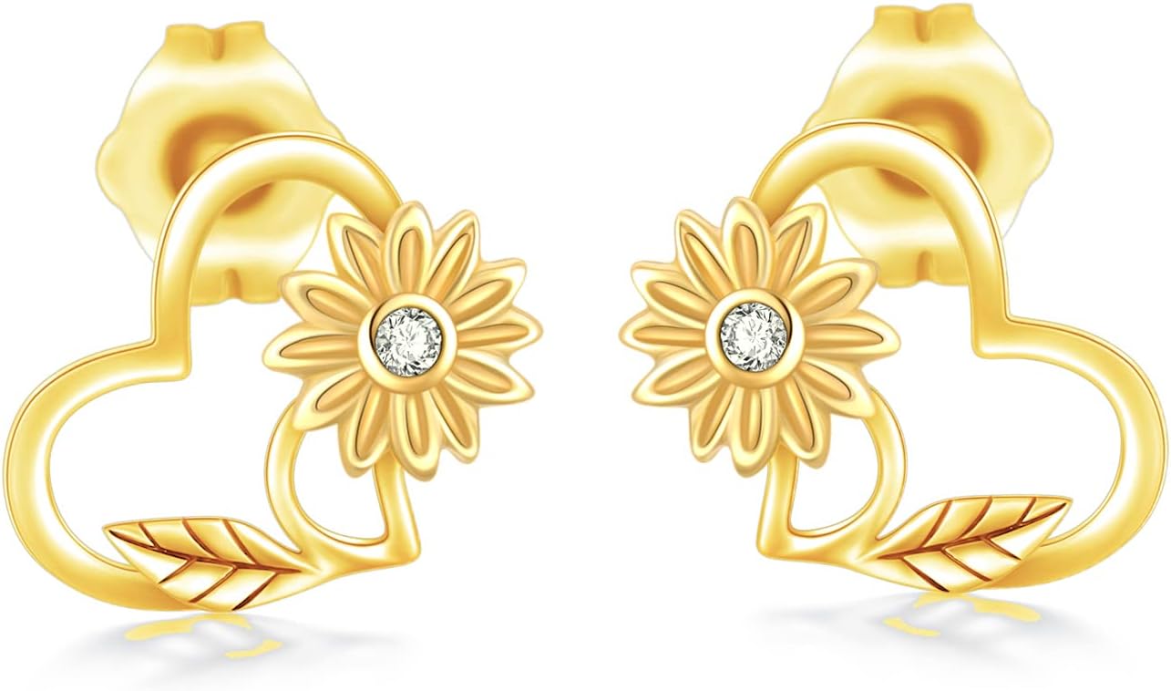 Solid 14k Gold Sunflower Heart Earrings for Women, Real Gold Love Studs Earrings Jewelry Gifts for Her