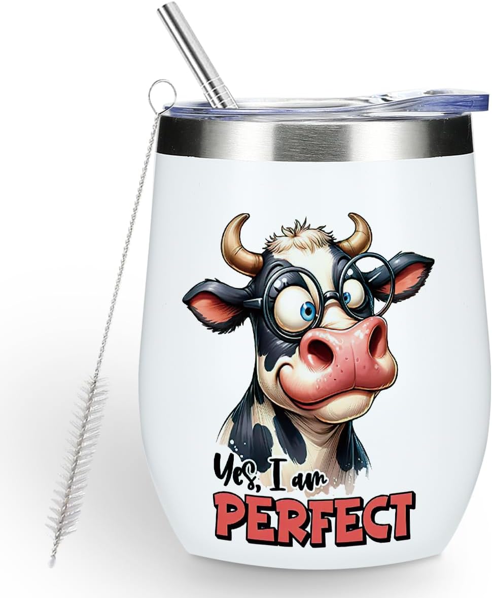 Funny Quotes Wine Tumbler, Cow Print Sarcastic Cow Gifts Double Wall Vacuum Insulated Coffee Mug Wine Glass 12 oz Tumbler with Lid for Women Men Brother Friend Teacher Birthday Appreciation Christmas