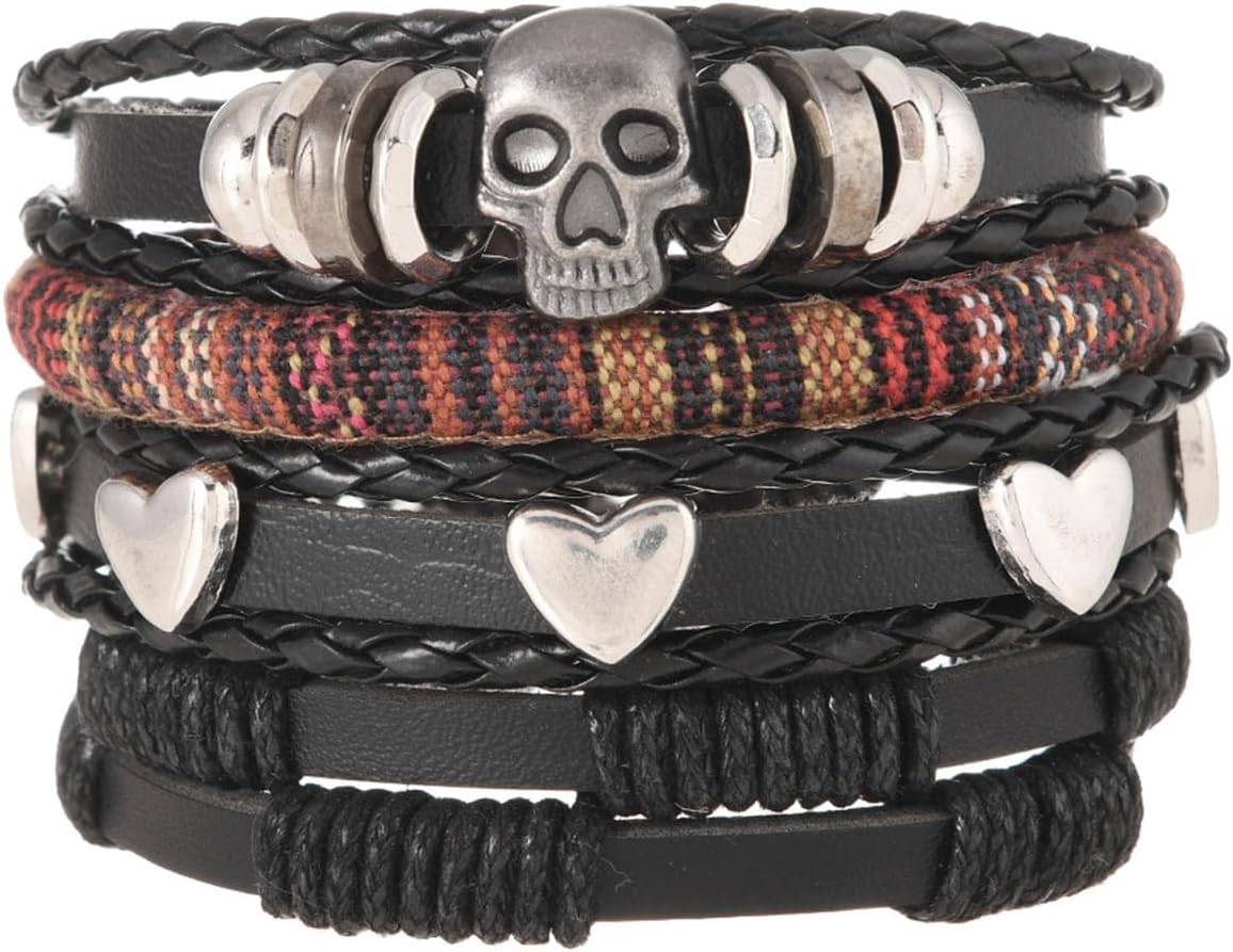 Viking Bracelet 4Pcs Leather Braided Bracelet Set Gothic Skull Heart Charm Multilayer Woven Cuff Wristband for Punk Streetwear (Adjustable)