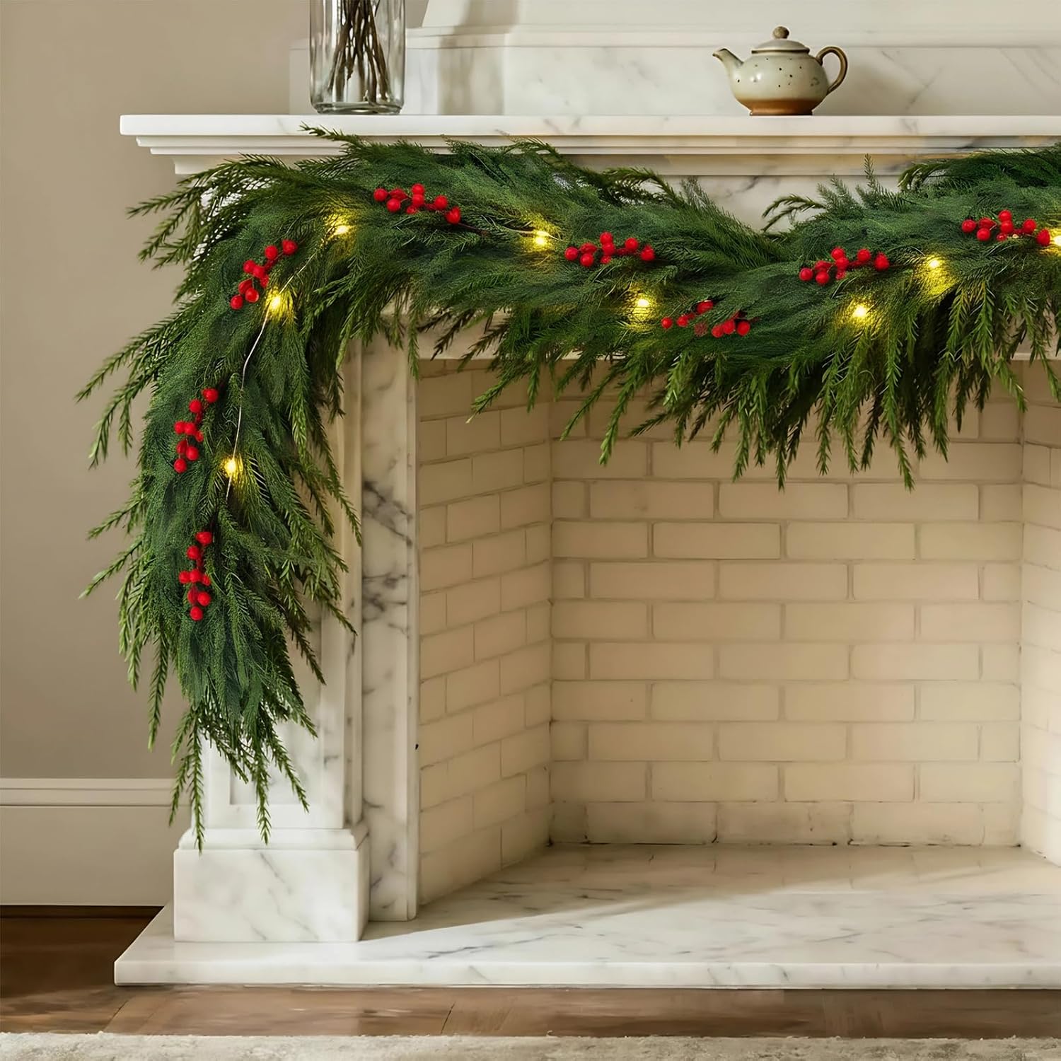 - Christmas Decorations Indoor:Norfolk pine garland crafted with premium PE material with 50 no battery powered LED lights, this realistic Norfolk pine garland features natural-looking needles branches and holly. Ideal for Christmas, winter weddings, Thanksgiving, and year-round home decor. Use it indoors (living room, dining room) or outdoors (porch, patio) for a fresh, evergreen look without maint enance.
