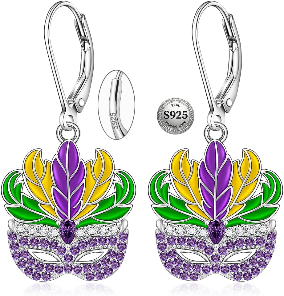 Mardi Gras Earrings Sterling Silver Small Mardi Gras Earrings for Women Dangle Studs Feather Mask Earring Womens Jewelry