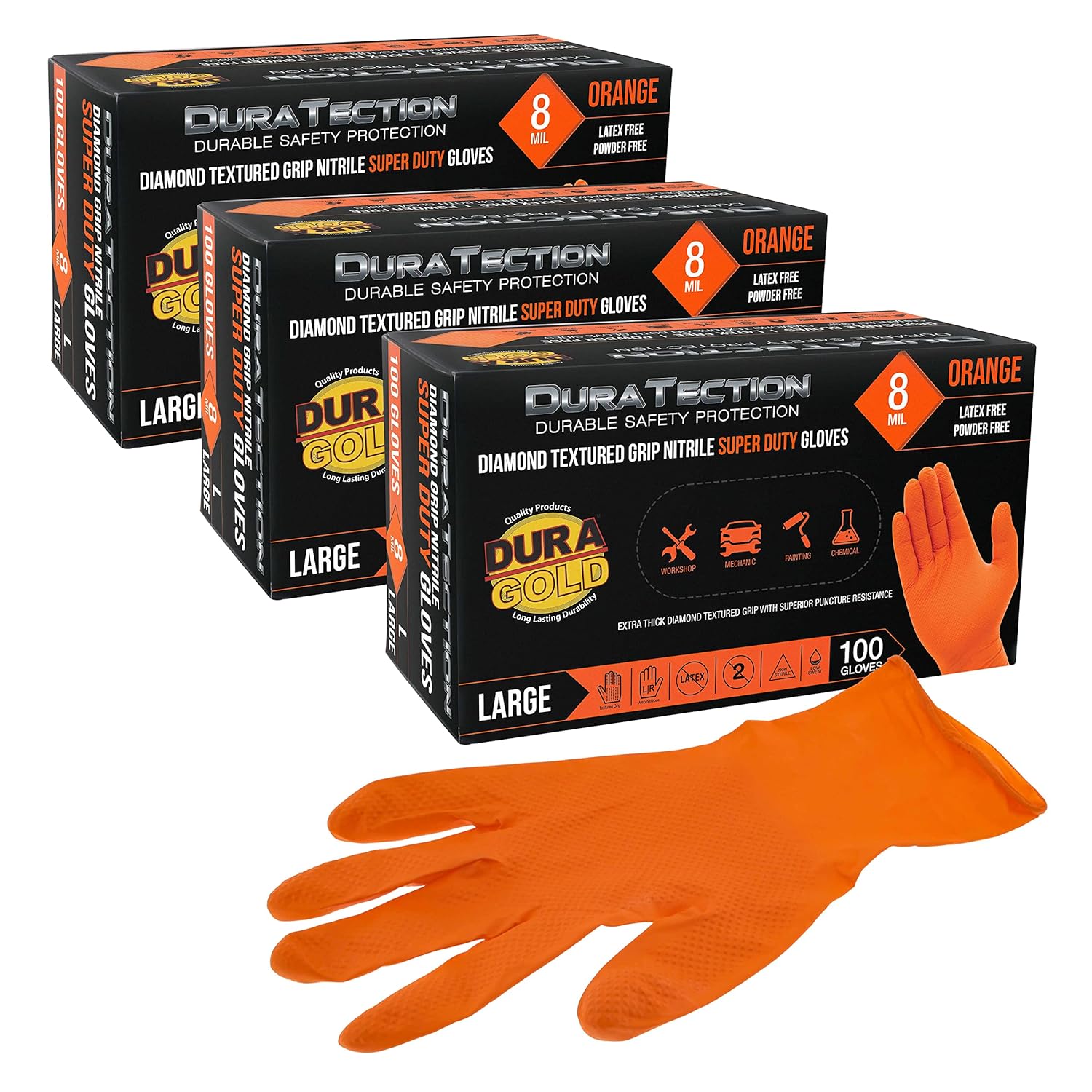 - Dura-Gold Duratection 8 MIL Orange Super Duty Diamond Textured Nitrile Disposable Gloves, 3 Boxes of 100, Large-Sized. Super strong, extra-thick 8 mil nitrile gloves with superior puncture resistance against cuts, snags, and abrasions for maximum safety protection. They offer incredible stretch with no tearing or pinching. See our glove sizing chart image to determine your correct glove size.