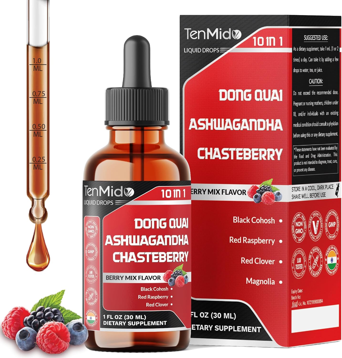 10in1 Liquid Dong Quai Supplement for Women with Ashwagandha, Chasteberry, Black Cohosh, Red Clover, Magnolia, Red Raspberry, Hops Flower, Lemon Balm, and Ginger - 30ml 1 Fl Oz