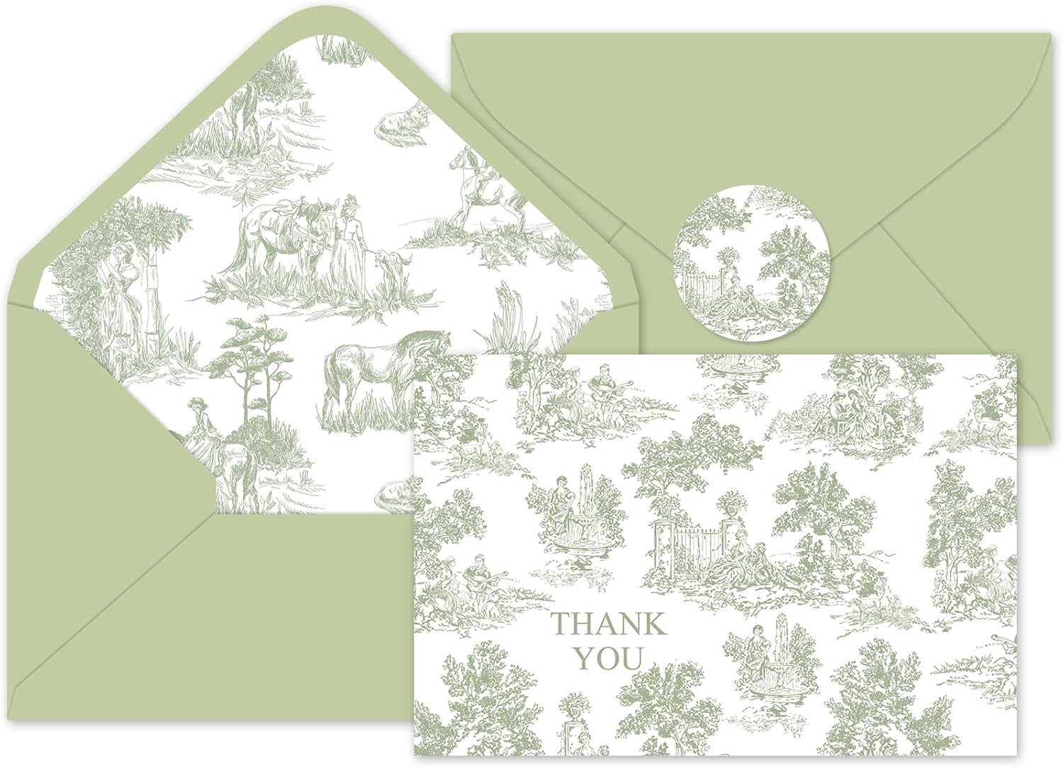 - You Will Get: 36 pcs thank you cards, 36 pcs envelops and 36 pcs stickers are included in the package, they are printed with french country scene, and colored in sage green, well meet your various needs and express your sincere gratitude