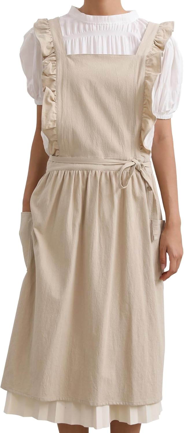 KITCHIEF Cotton Linen Apron for Women Cross Back Smock Apron Pinafore Dress with Pockets for Kitchen Gardening Painting