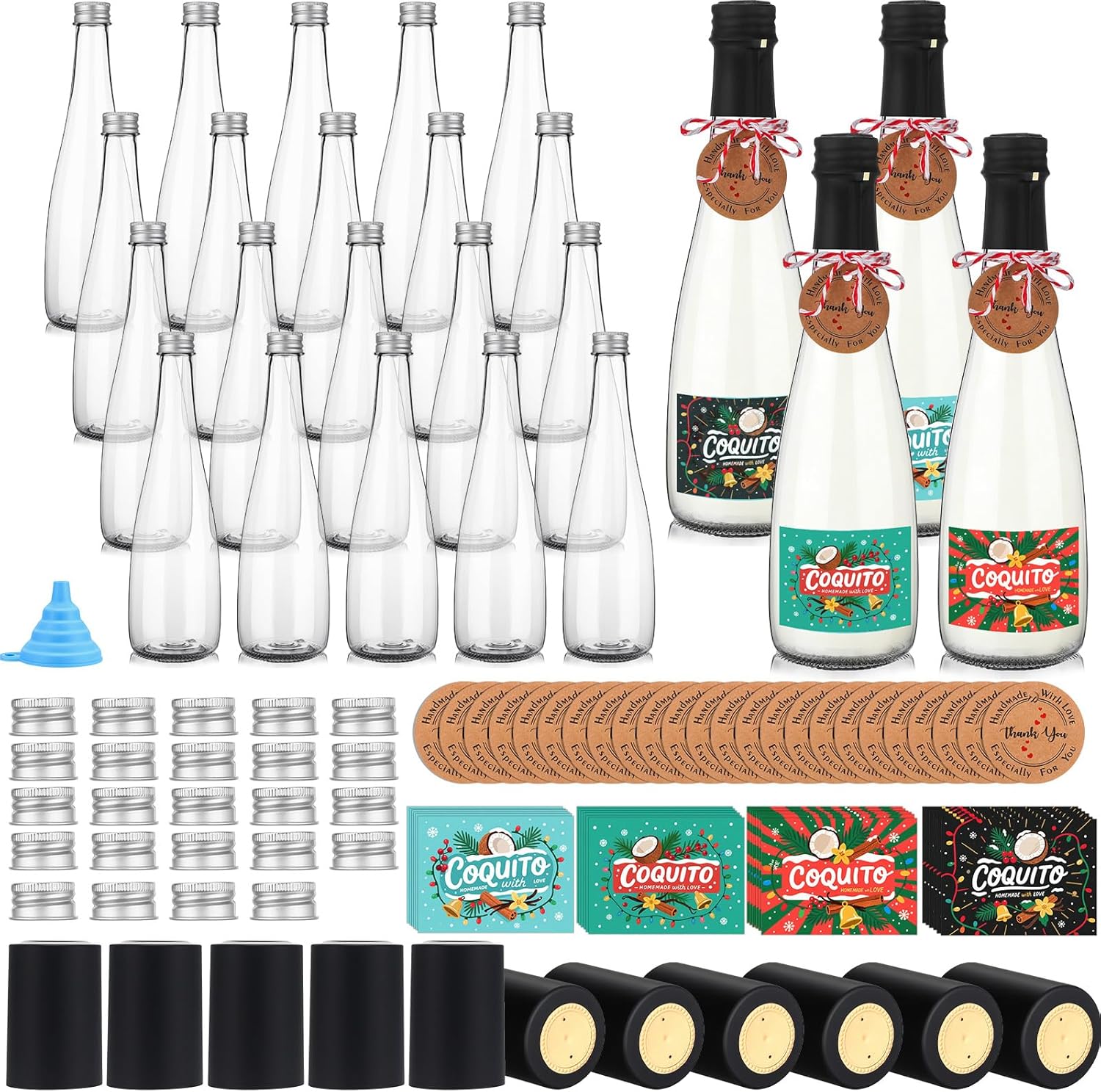 - Package Includes: this set includes 24 Christmas plastic coquito bottles with screw caps, 24 black heat shrink caps, 24 decorative coquito stickers, 25 labels, 1 long hemp rope, and 1 handy funnel; This comprehensive kit ensures you have all the components to start your creative beverage journey