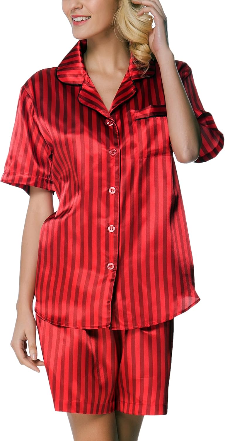 Women's Short Sleeve Classical Silky Satin Pajamas, Short Bottom Sleepwear