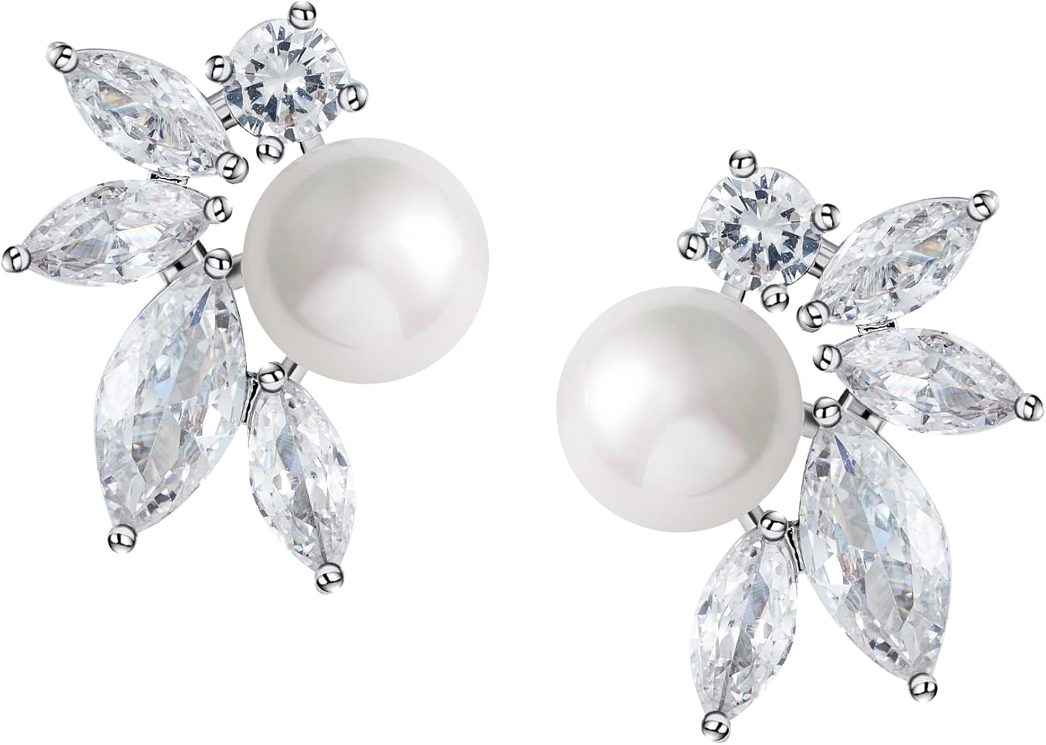 SWEETV Pearl Wedding Earrings for Brides, Bridesmaids, Bridal Pearl Cluster Earrings, Cubic Zirconia Pearl Drop Stud Earrigs for Women, Formal Jewelry Mother's Day Gifts