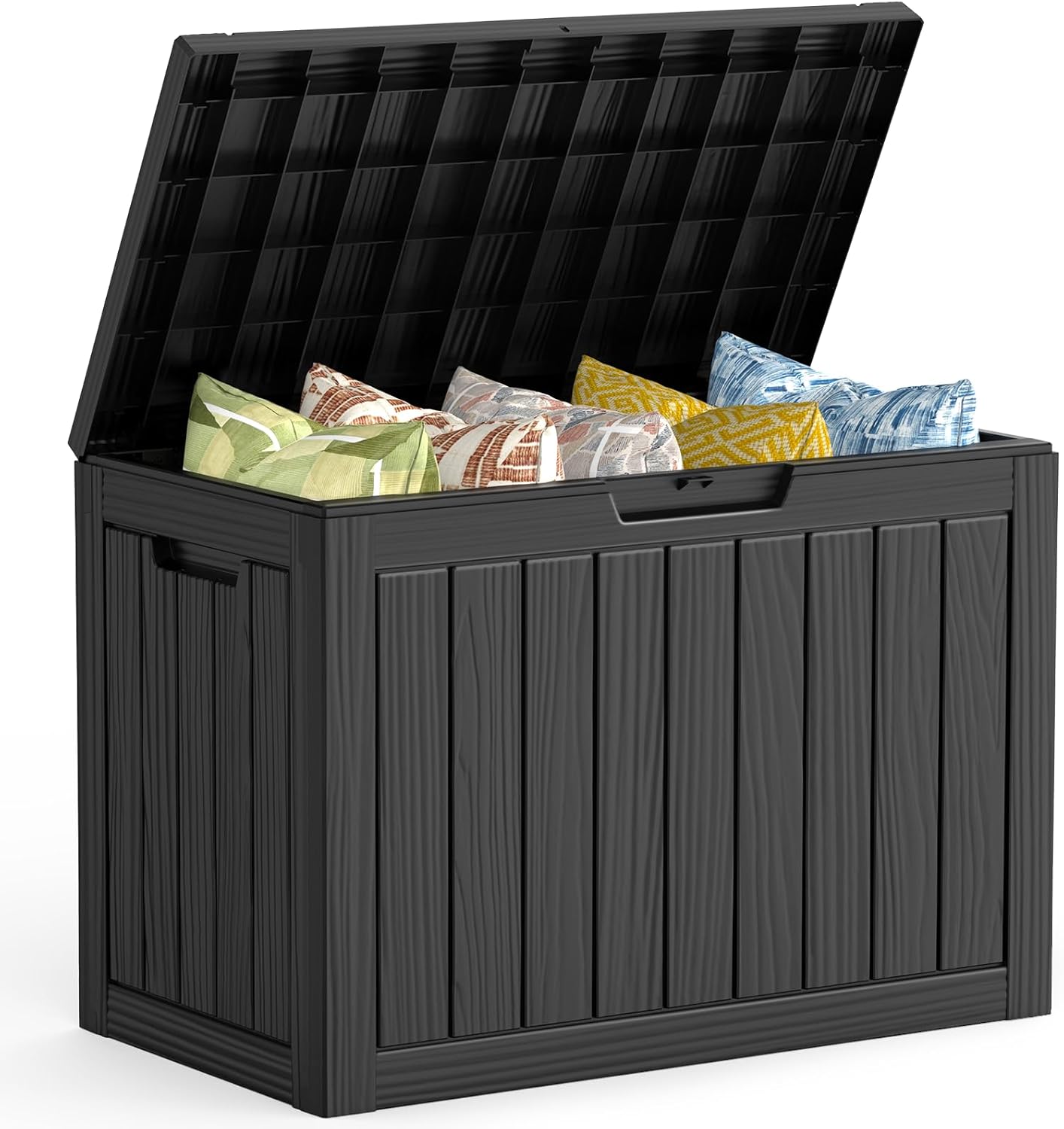- 【Weatherproof & Durable】- Made from upgraded PP resin with a refined woodgrain finish, this deck box features a UV-resistant and waterproof surface that keep your items clean and dry year-round with minimal maintenance, ensuring long-lasting performance
