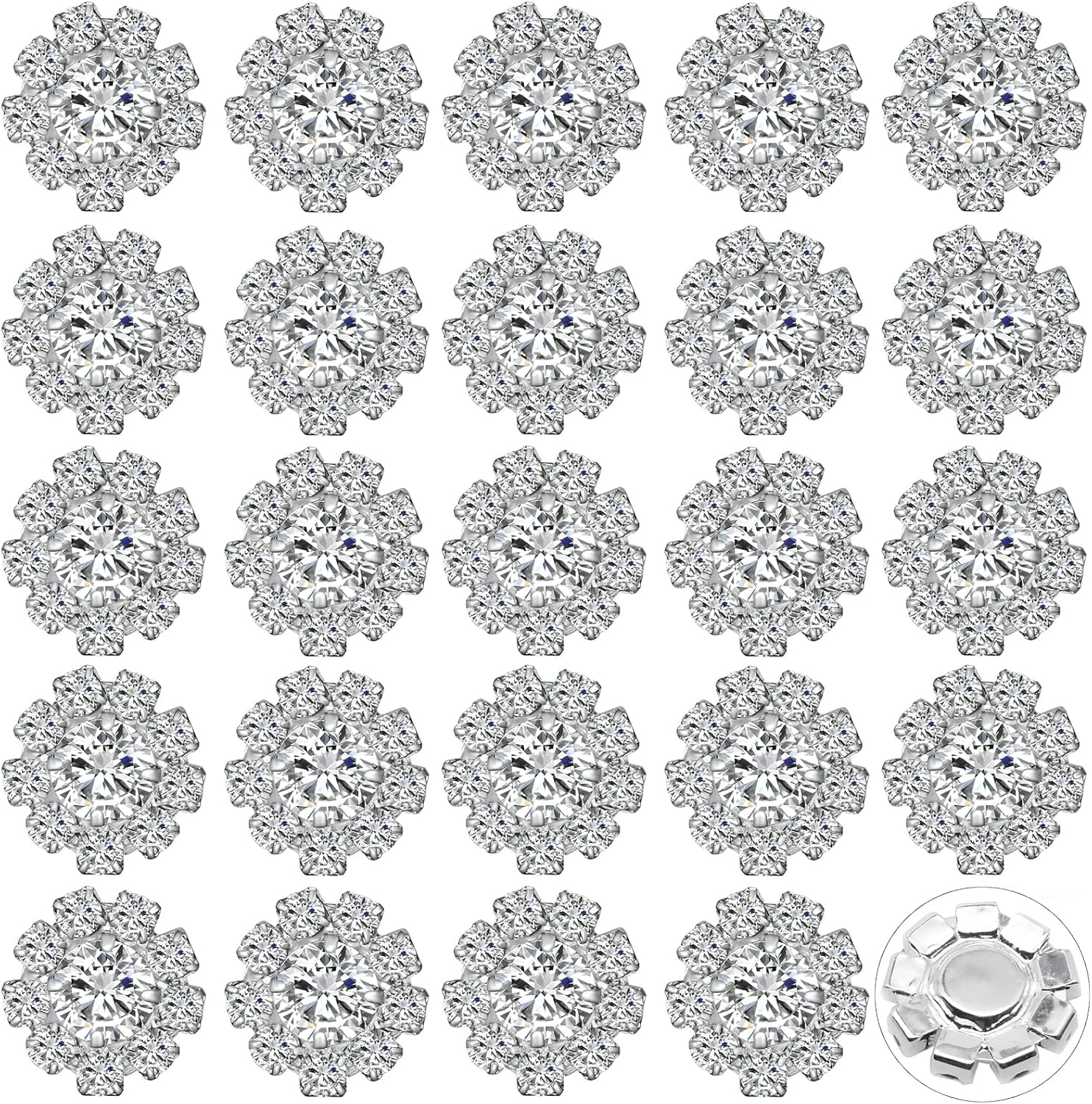 24 Pack 16MM Sparkle Clear Rhinestone Buttons Flatback Metal Embellishments Glass Crystal Bulk for Craft DIY Wedding Bouquets Decoration,Silver Plated/Flat