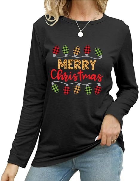 Merry Christmas Shirts for Women Long Sleeve Xmas Casual Graphic Blouse New Year Festival Tops Winter Basic Indoor Tee