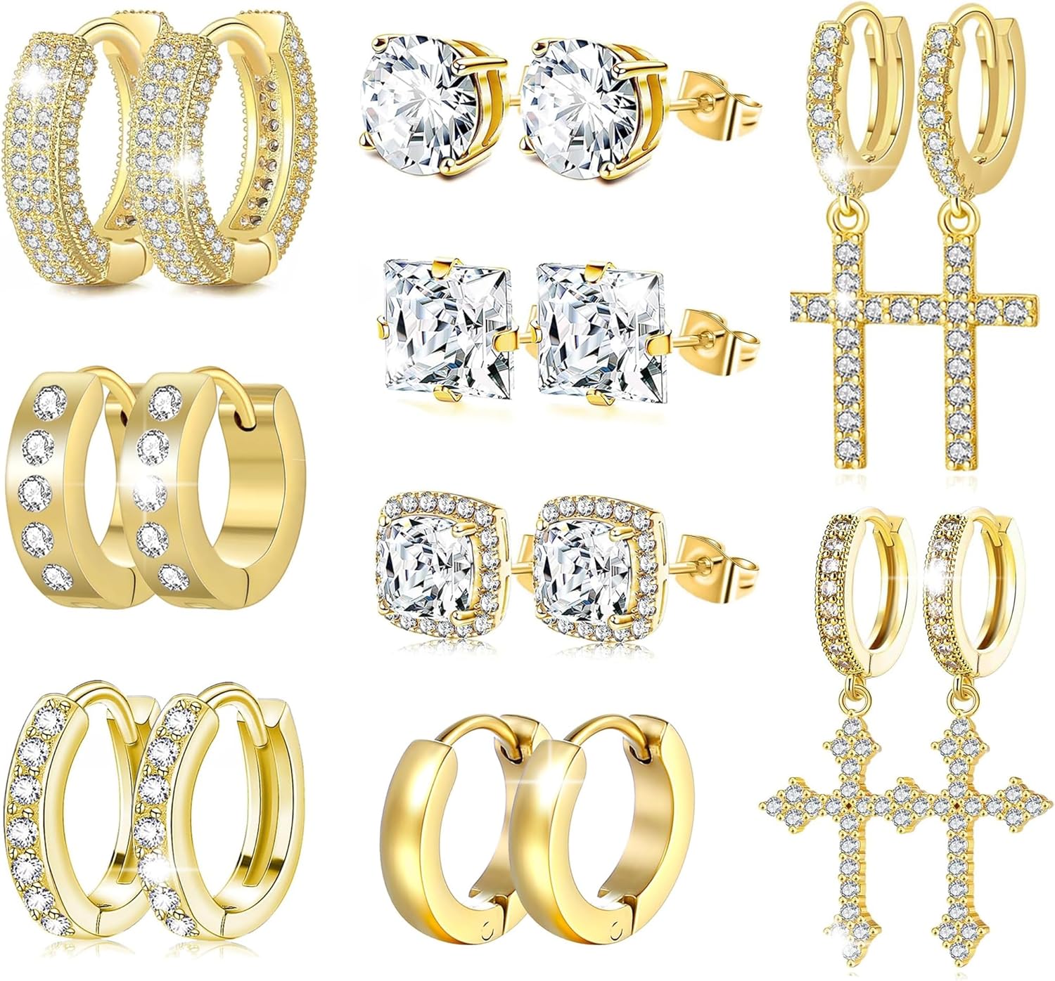9 Pairs Earrings for Men Stainless Steel Small Hoop Earrings Hypoallergenic CZ Cross Dangle Earrings Cubic Zirconia Stud Earrings Huggie Men's Earrings Set
