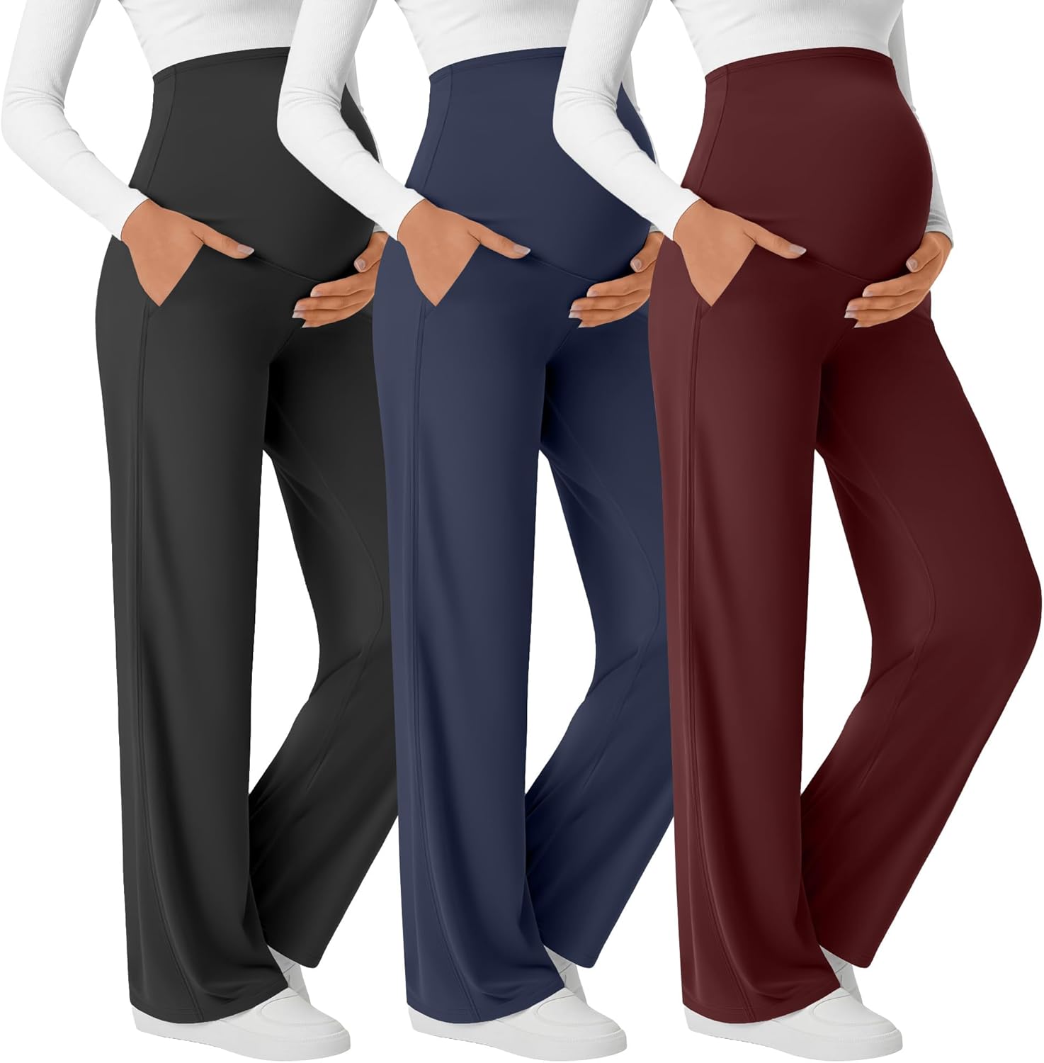 3 Pack Women's Maternity Yoga Pants Over The Belly Pregnancy Pants Wide Leg Lounge Trousers with Pockets
