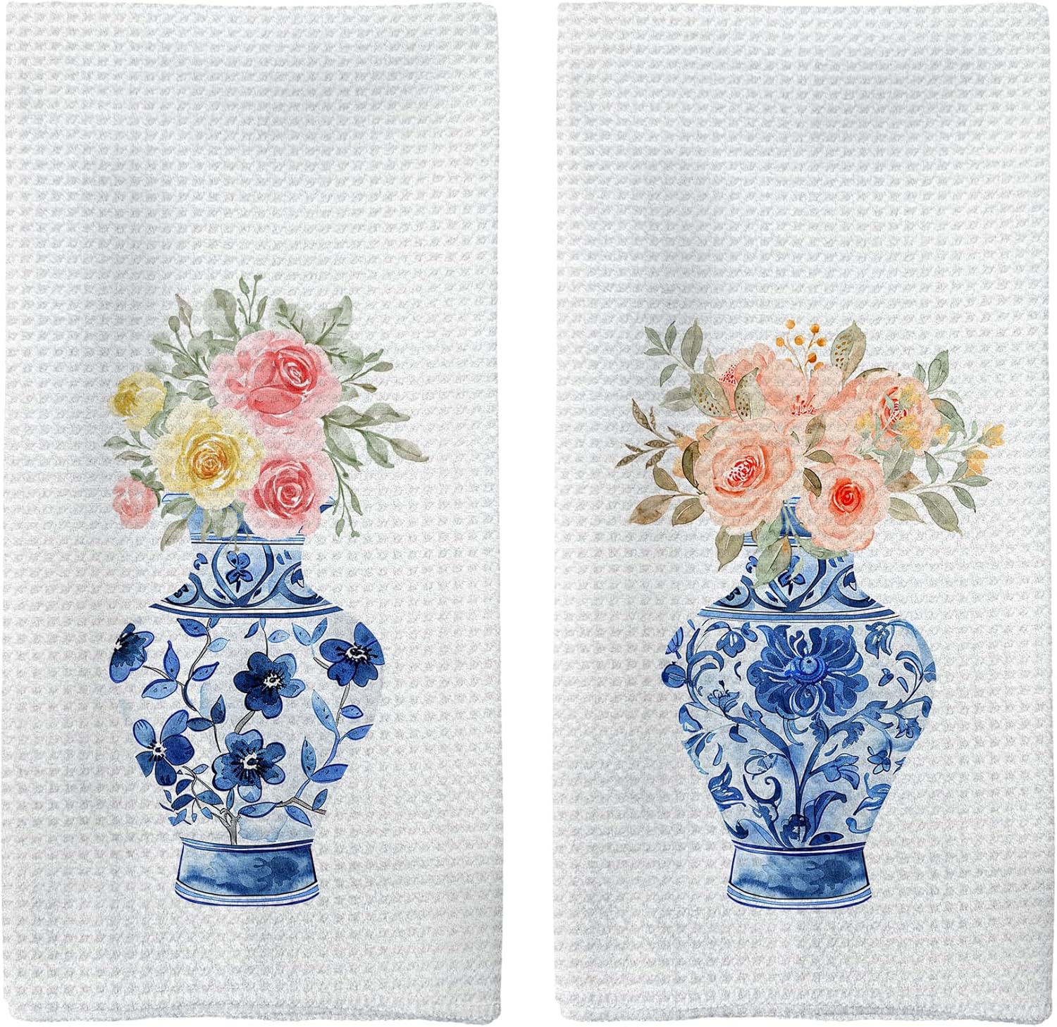 Blue and White Porcelain Kitchen Towels, Watercolor Floral Chinese Vase Hand Towels, Vintage Preppy Dish Towels Dishcloths Tea Towels for Kitchen, Chinoiserie Bathroom Decor Set of 2, 16x24in