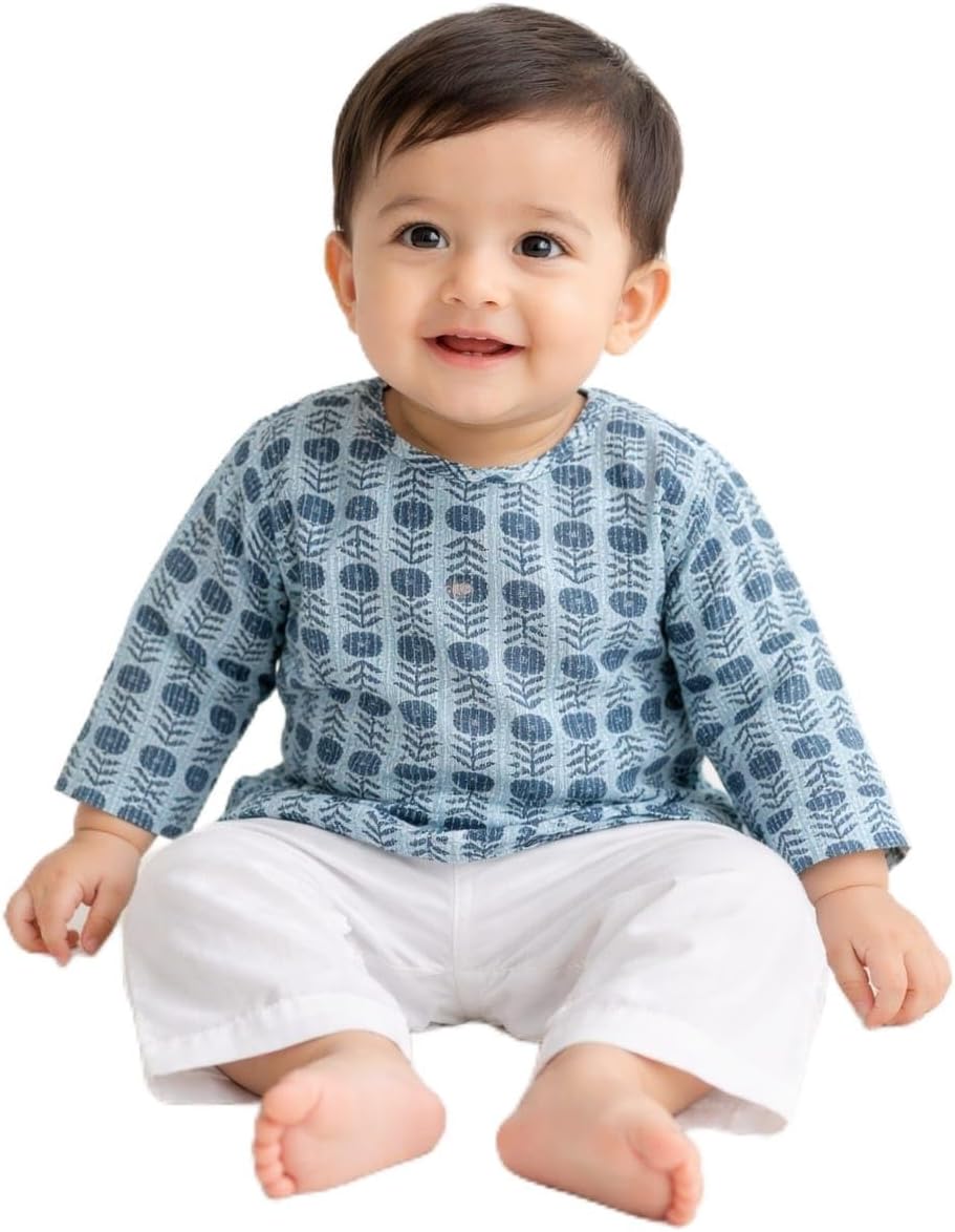 The Root & Craft Baby 2-Piece Outfit Set, Floral Printed Long Sleeve Shirt Kurta with White Pants, Blue and White (0-3 Month Newborn Baby)
