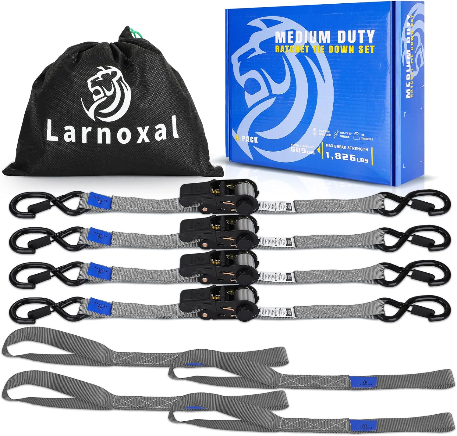 - 【Complete Set】Each set includes 4 medium-duty ratchet tie down straps with S hook, 4 soft loops, and a carrying bag for easy storage. Suitable for various scenarios such as trucks, motorcycles, furniture moving, and more!