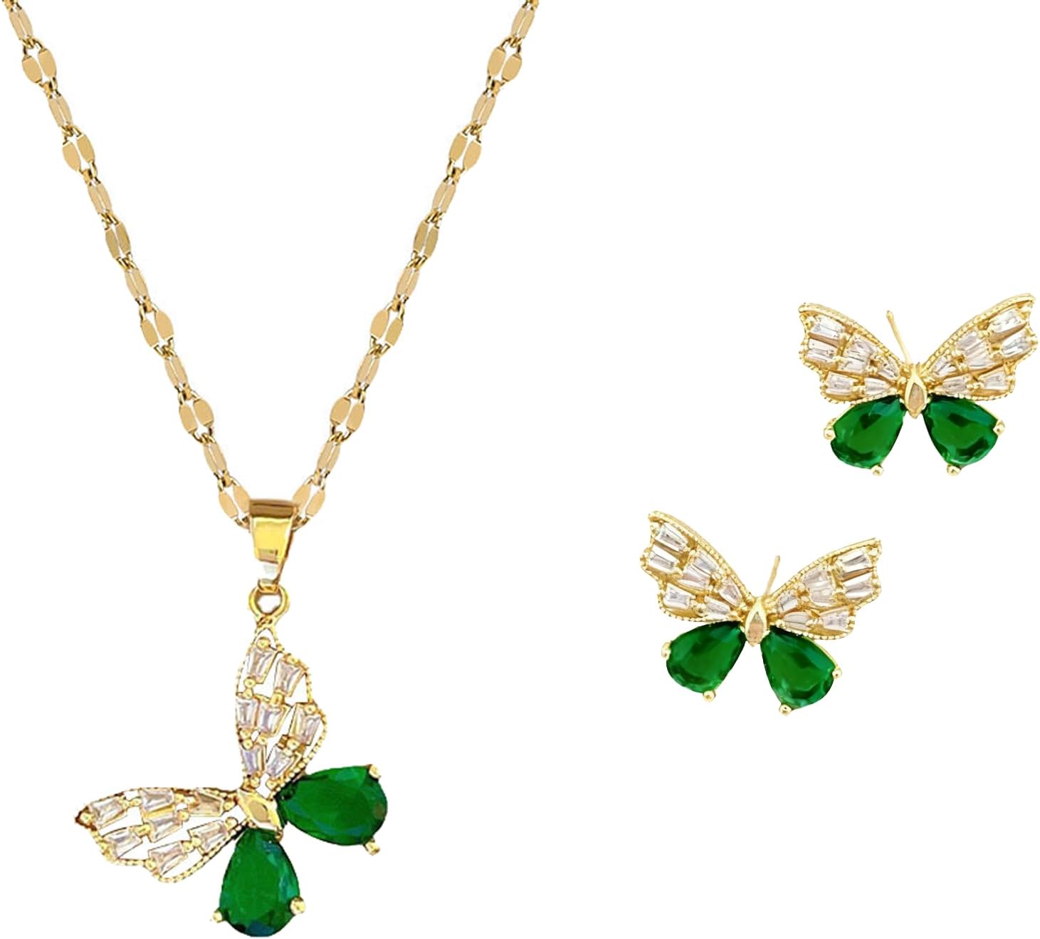 Butterfly Necklace And Earring Set For Women, 14k Gold Plated Green Cubic Zirconia Butterflies Stud Earrings Pendant Necklaces Personalized Trendy Christmas Birthday Jewelry Gifts