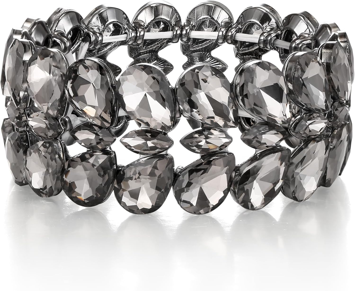 EVER FAITH Elegant Austrian Rhinestones Double Layers Teardrop Marquise Elastic Stretch Bracelet for Women Gray Black-Tone