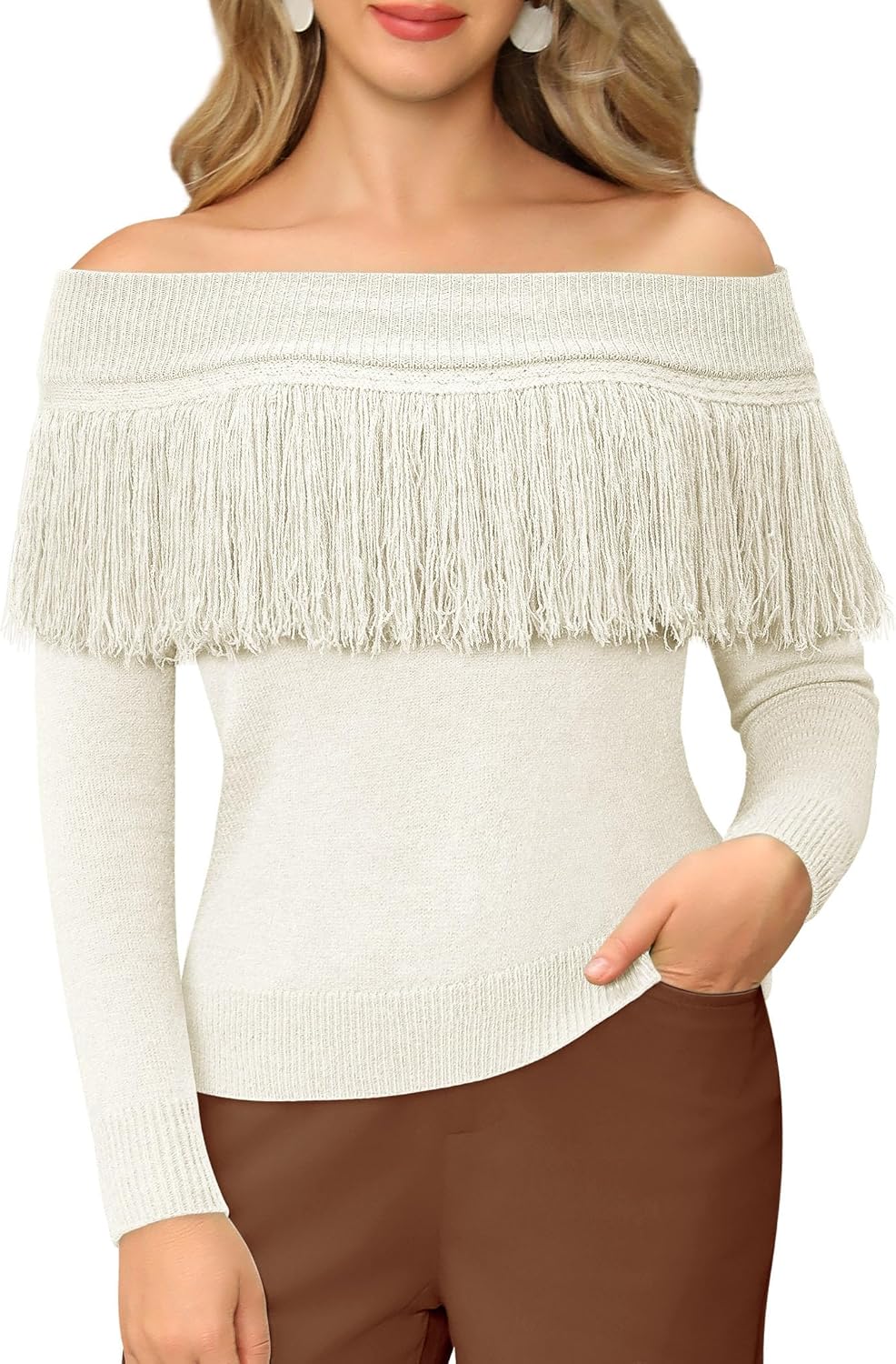 WLLW Women's Fringe Tops Juniors Boat Neck Sweater Long Sleeve Pullover Sweater Slim Fit Off Shoulder Sweaters