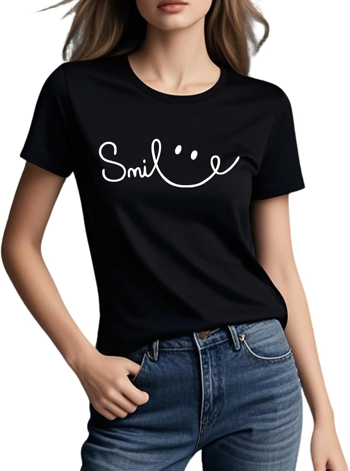 Women Smile Graphic T-Shirt Cute Funny Casual Short Sleeve Tops