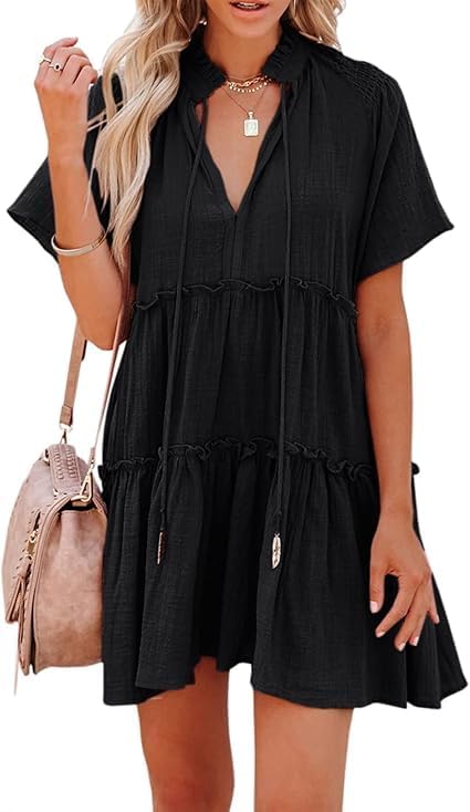 Dellytop Womens Drawstring V Neck Dress Ruffle Tiered Short Sleeve Babydoll Tunic Swing Sundresses Black