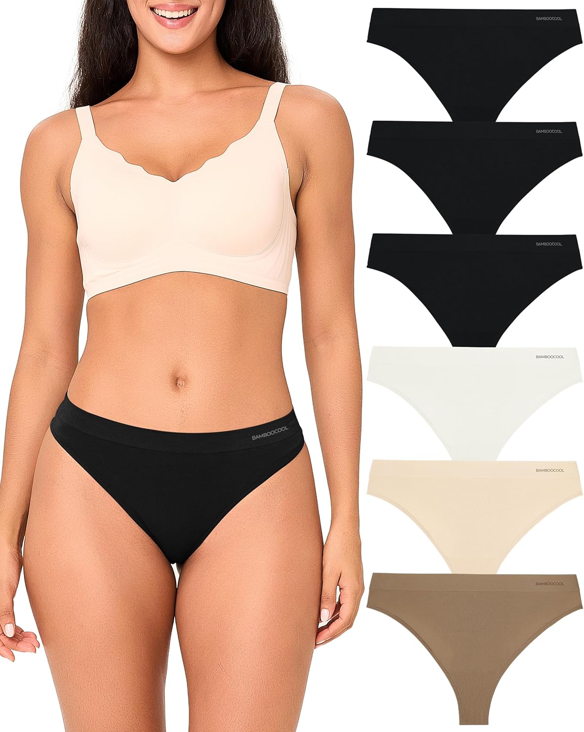 BAMBOO COOL Women's Thongs Seamless Moisture-Wicking Breathable Underwear High Stretchy Mid Waisted Panties Tagless 6 Pack