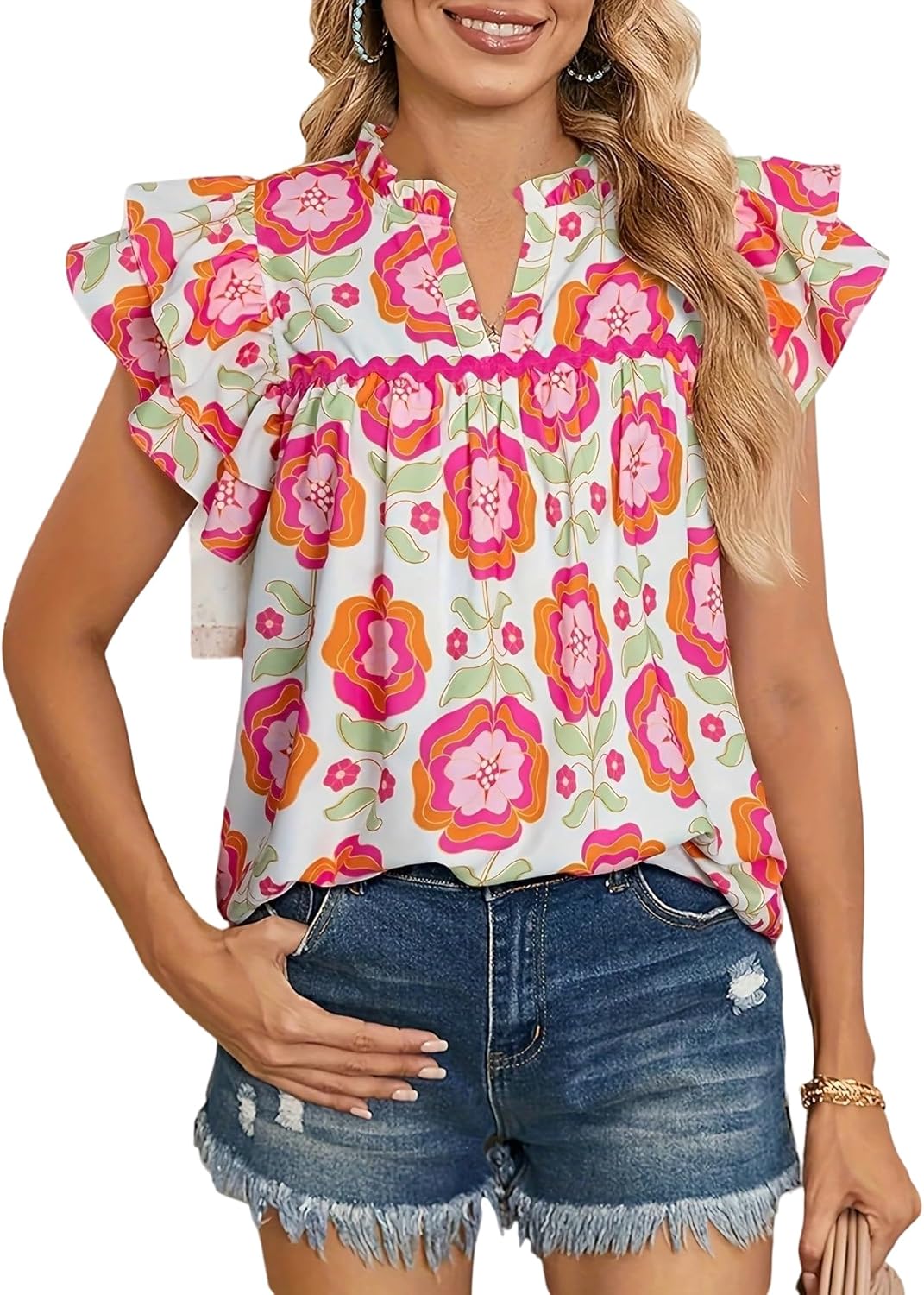 Floerns Women's Striped Ruffle Cap Sleeve Tops Summer Blouse Tops V Neck Business Causal Work Outfits for 2025