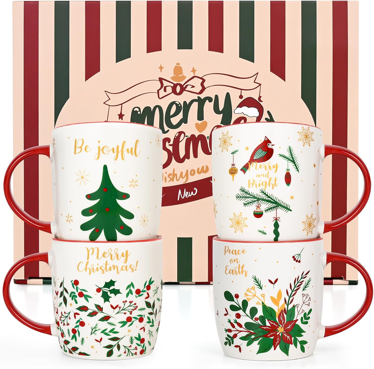 - UNIQUE DESIGN: The pattern on each Christmas coffee mug is different. There are various Christmas elements on them, such as Christmas tree, Christmas bell, poinsettia and robin. The strong Christmas atmosphere make these Christmas mugs suitable for Christmas and New Year's use.
