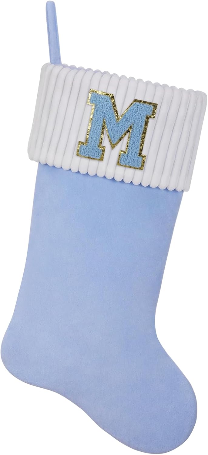 20 Inches Letter Embroidered Christmas Stocking,Personalized Light Blue Velvet Christmas Stocking,Family Holiday Decorations and Xmas Gift(M)