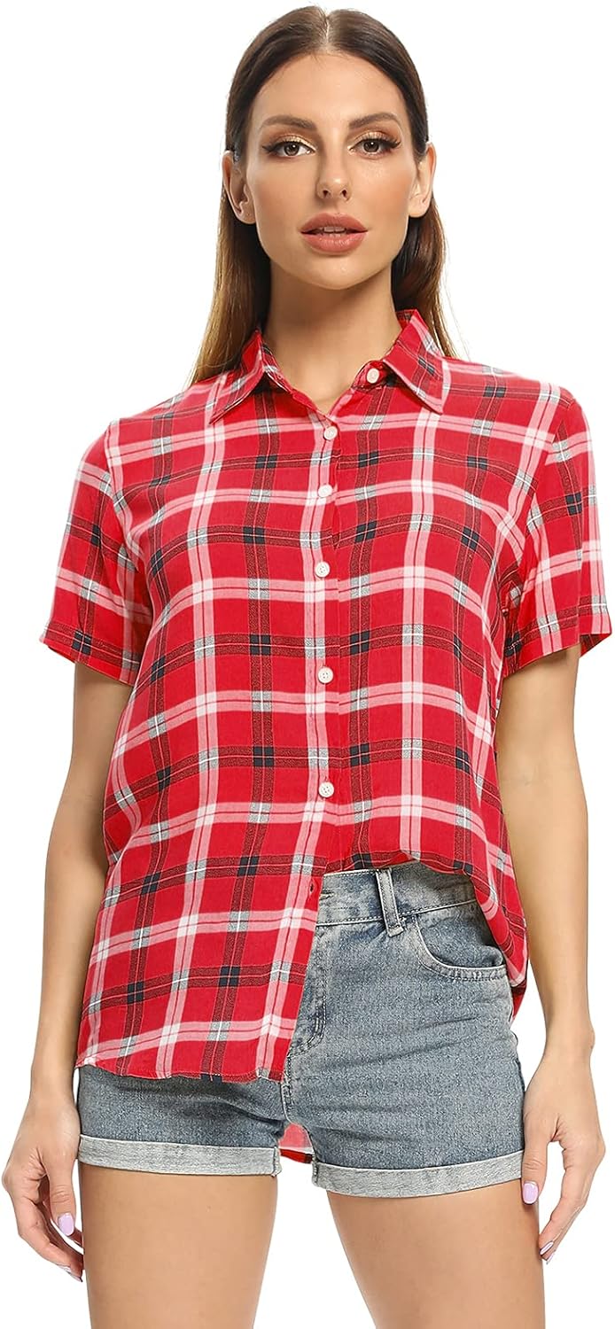 OCHENTA Women's Short Sleeve Plaid Button Down Shirt Casual Summer Blouses Tops C White Red 2XL