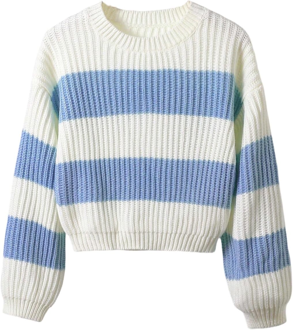 MakeMeChic Girl's Striped Sweater Long Sleeve Colorblock Roundneck Drop Shoulder Knit Loose Pullovers
