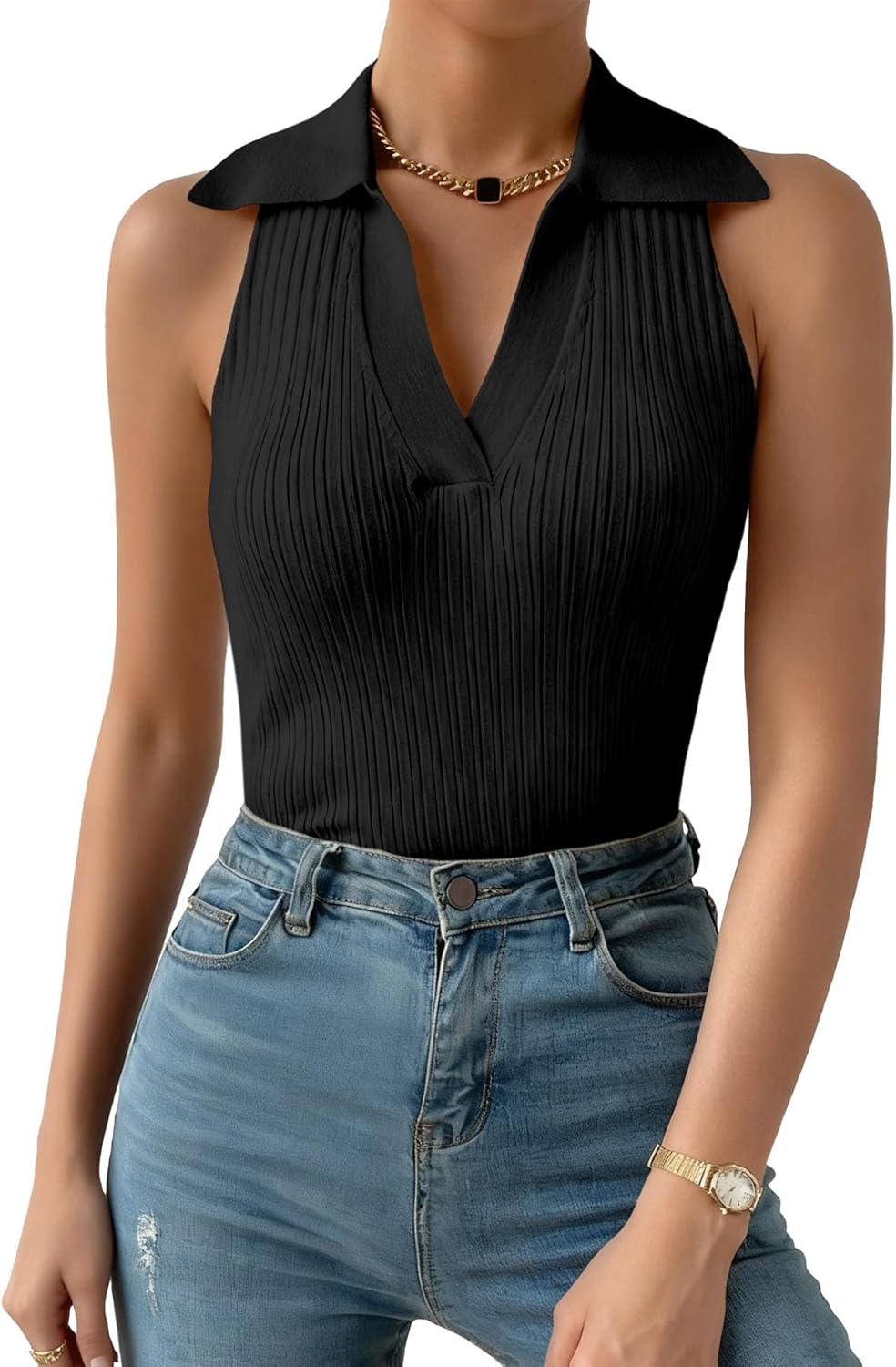 Women Ribbed Tank Top, Going Out Collared Camisole Top Business Casual Sleeveless V Neck Fitted Polo Shirt