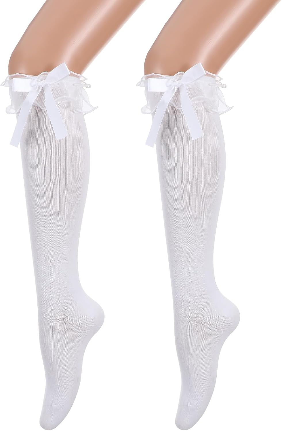 White Knee High Socks with Lace Ruffle Trim Socks for Women Girls, Cute White Ruffle Sock, Cotton Stockings Dress Sock for Lolita Birthday Halloween Christmas, Sport Team