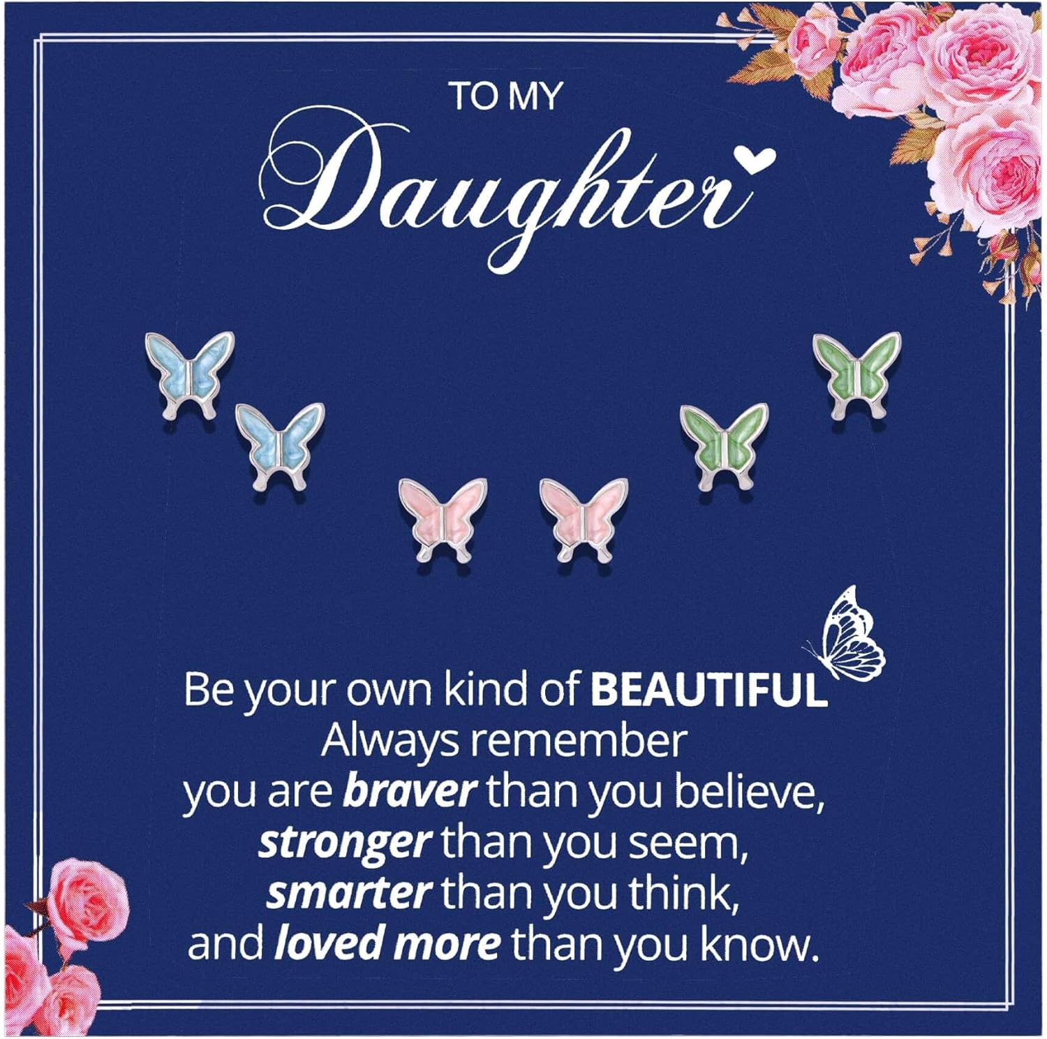 Butterfly Earrings for Daughter, Inspirational Stud Earrings Gift with Message Card, Be Your Own Kind of Beautiful Jewelry from Mom or Dad — 1 Pair or 3-Pair Set