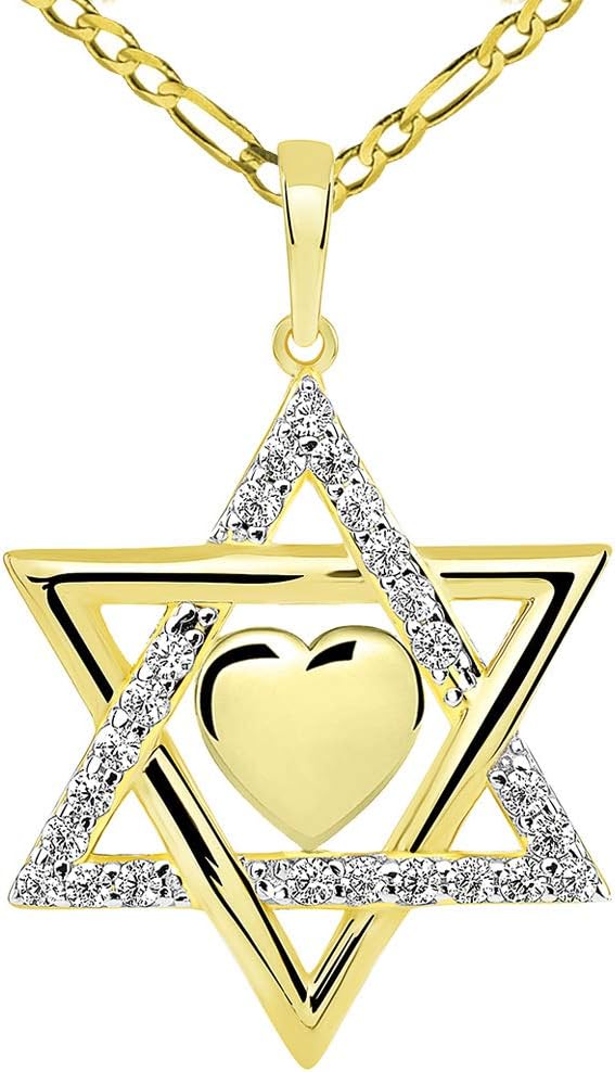Jewelry America 14k Yellow Gold Hebrew Love CZ Star of David with Heart Pendant Figaro Necklace