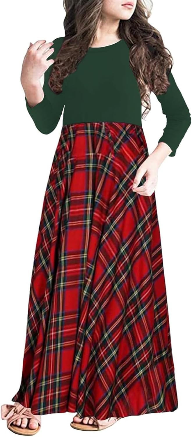 21KIDS Girls Buffalo Check Plaid Dress Kids Long Sleeve Maxi Dresses with Pockets for Girls 6-14 Years