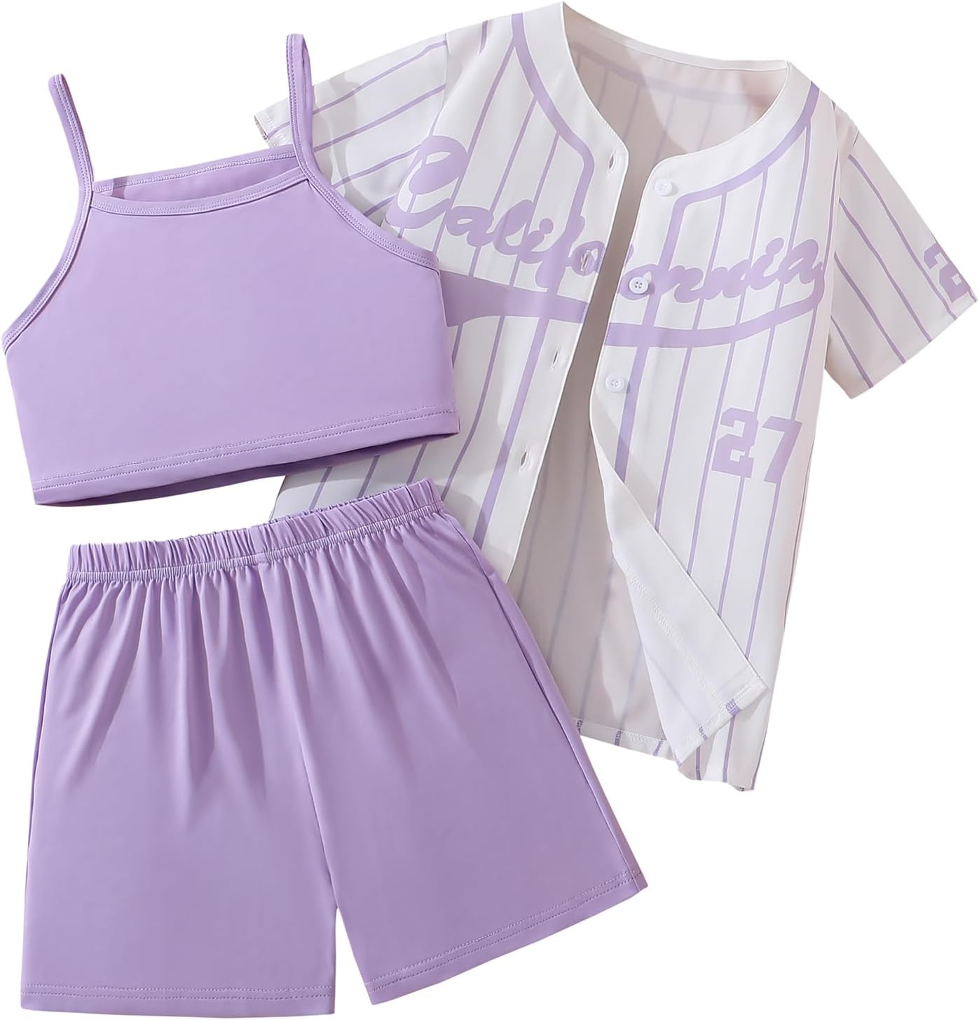 Hilinker Girls Graphic 3 Piece Outfits Short Sleeve Striped Cardigan and Crop Cami with Shorts Set