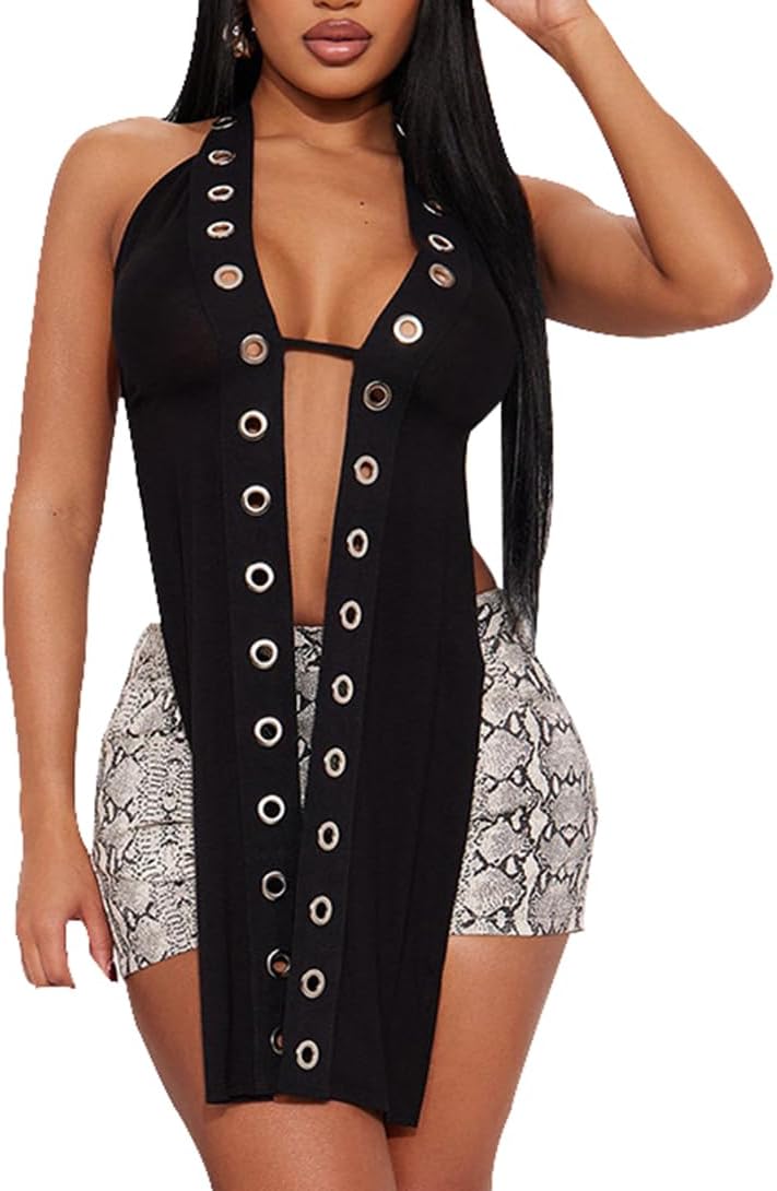 Women's Punk Long Tank Top Hollow Out Gothic Grommet Eyelet Halter Cutout Sleeveless Backless Tie Split Cami Vest