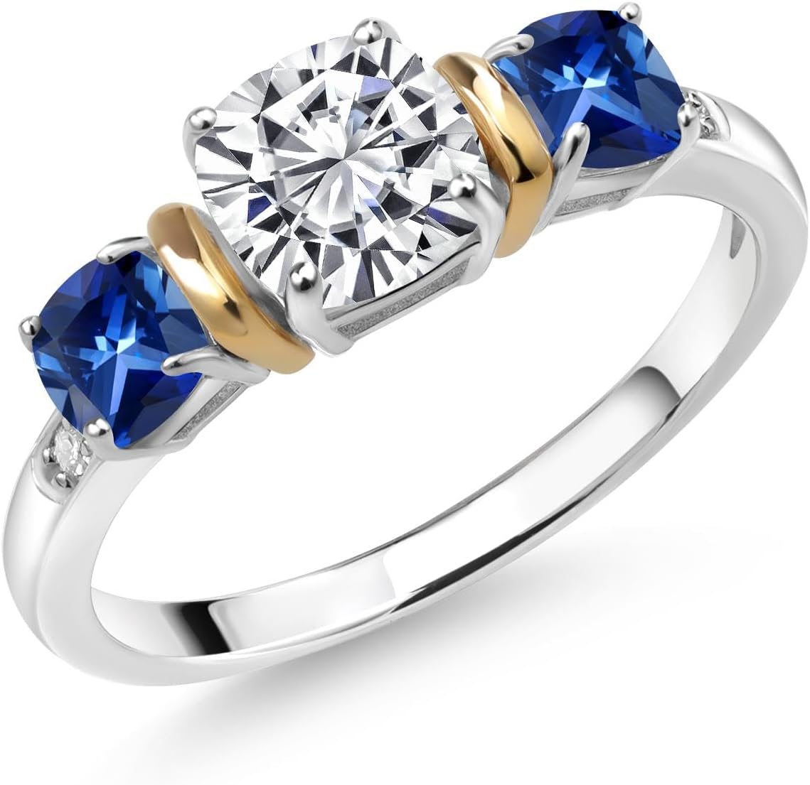 Gem Stone King 2.72 Cttw 925 Silver & 10K Yellow Gold IGI Certified Lab Grown Diamond and Created Sapphire 3 Stone Ring For Women | 1 Ct Center Cushion Cut Diamond | E-F Color VS1-VS2 Clarity