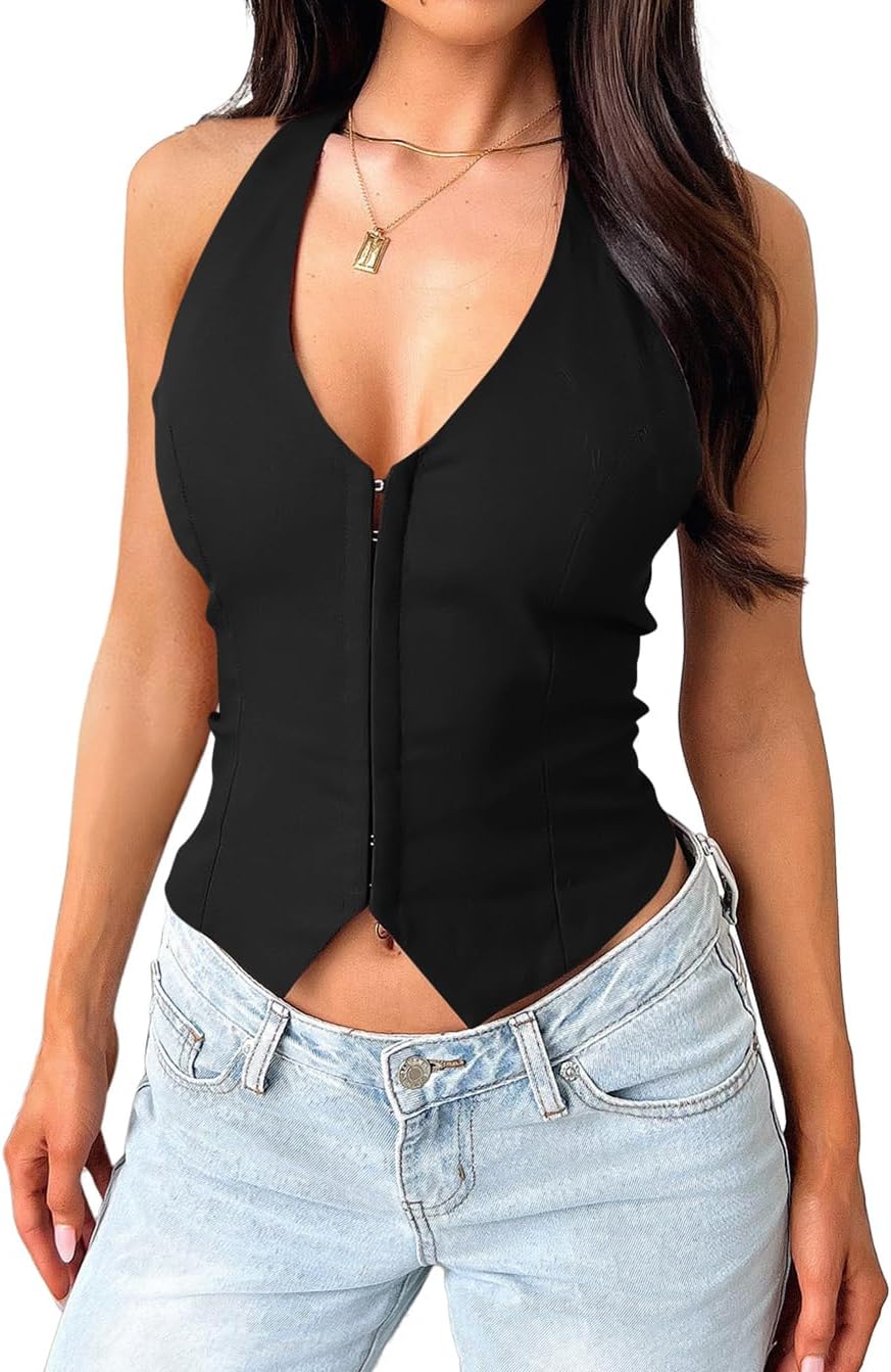 Women's Sexy Halter V Neck Tank Top Summer Sleeveless Trendy Vest Club Date Night Going Out Tops