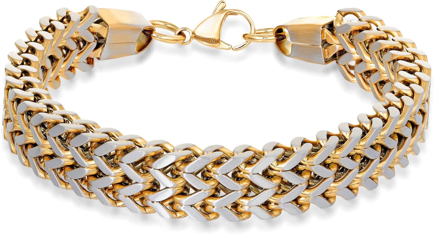 Metro Jewelry Two Tone Foxtail Chain Bracelet for Men in Stainless Steel with Yellow Gold Ion Plating - 8.5 Inches Long 13 mm Wide with Lobster Claw
