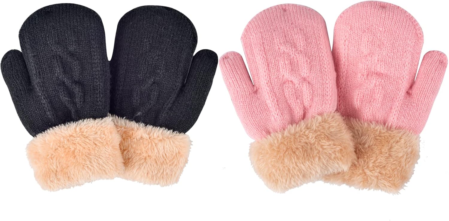 2 Pairs Kids Winter Knit Gloves Boys Girls Warm Thermal Cable Knitted Gloves 2-6-10-14 Year Wool Fleece Lined Mittens